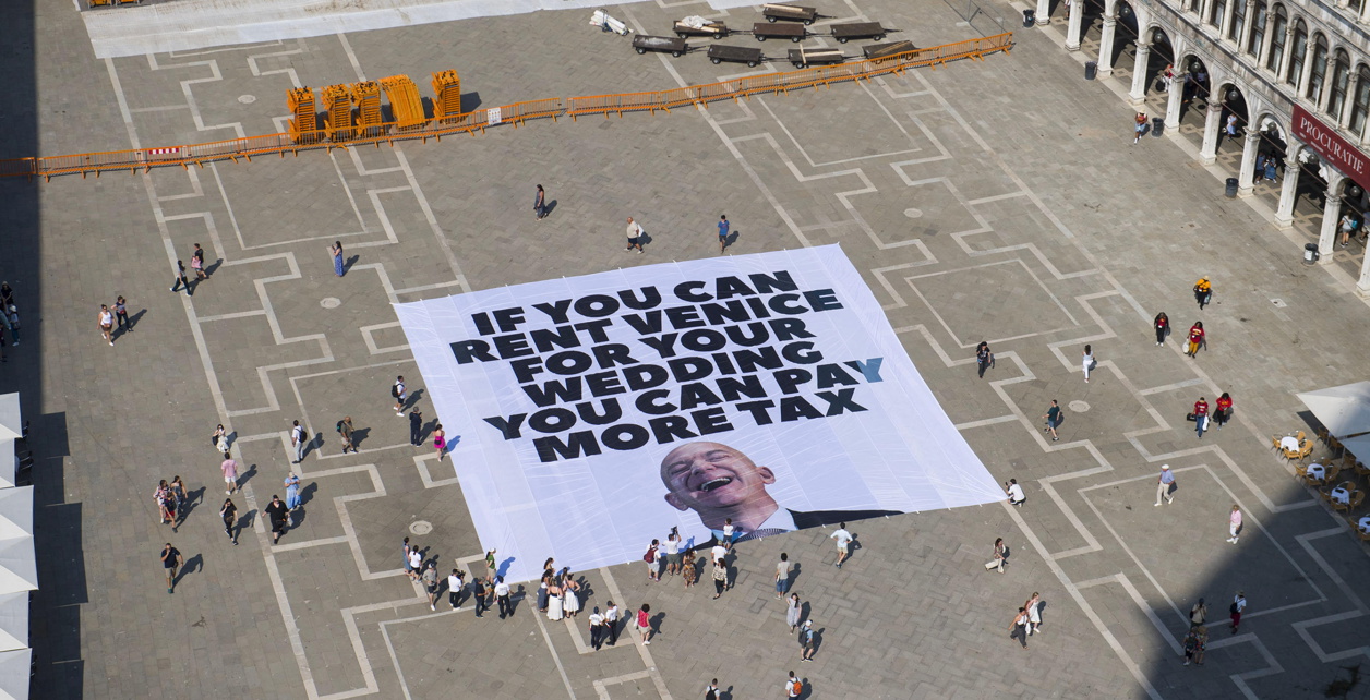 Aktivisti iz Greenpeacea Italija i britanske grupe "Svi mrze Elona" (Muska) razvili su divovski transparent na središnjem Trgu svetog Marka sa slikom Bezosa kako se smije, uz natpis: "Ako možete unajmiti Veneciju za svoje vjenčanje, možete plaćati i veći porez."