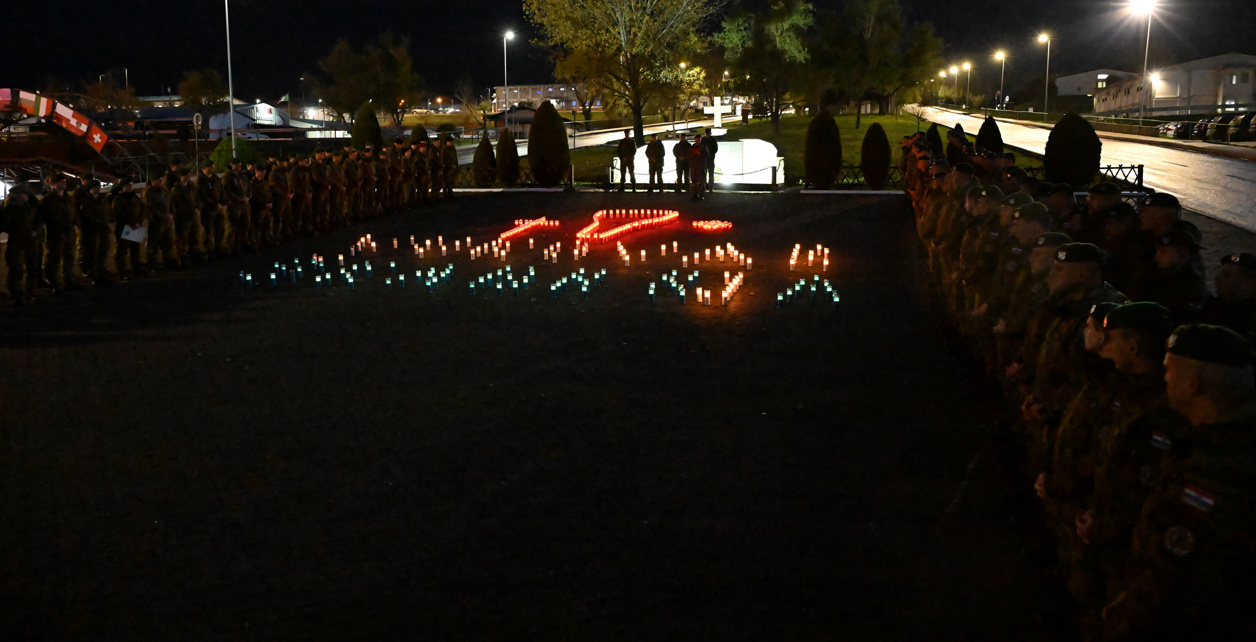 Pripadnici 43. hrvatskog kontingenta u NATO-ovoj operaciji potpore miru KFOR u vojnom kampu “Villaggio Italia” u Peći u Republici Kosovo ispred središnjeg križa svijećama su ilustrirali Vodotoranj i napisali imena Vukovar i Škabrnja.